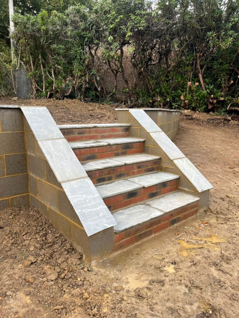 To bring their vision to life, we conducted several detailed consultations, ensuring that the final design would cater to the needs of the entire family. While Andy and Alison preferred to minimise further hard landscaping, it was necessary to construct a retaining wall and install steps leading to the top tier. This approach allowed us to repurpose much of the surplus soil and take full advantage of the elevation in the garden’s upper corner.