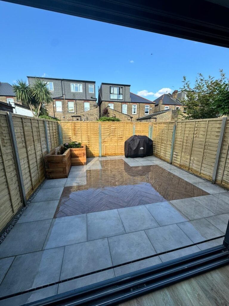 The brief was to create a seamless transition from the lounge through the bi-fold doors, extending the feeling of indoor living into the garden. With limited space, the challenge lay in zoning the area to create visual interest rather than one uniform surface.